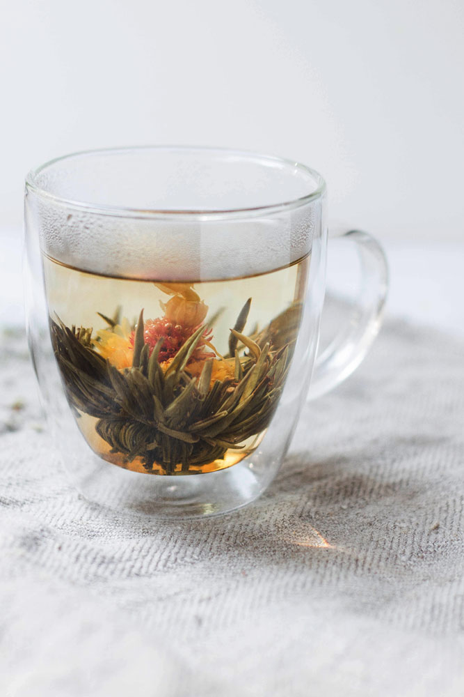 Flowering tea should always be brewed in a glass teapot or a glass cup. Another (more subjective) flowering tea benefit of each and every flowering tea is pure relaxation and bringing peace and beauty into your life. Watching the leaves unfurl is a relaxing experience. Flowering teas need a bit more time to brew and a bit higher temperature, so white tea such as silver needle and black teas are the best options. For green flowering teas we recommend a bit lower temperature and re-steep them until they fully unfurl. You can re-steep high quality black and white flowering teas at least two times.